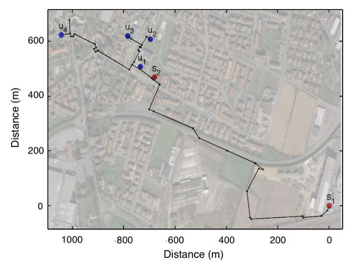 Network layout. Red circles indicate sources (s1, corresponding to the waste heat, and s2, corresponding to the aquifer wells), and blue circles indicate users. Distances are measured from the source s1. s = sources and u = users.S. Calixto, M. Cozzini, and G. Manzolini, “Modelling of an Existing Neutral Temperature District Heating Network: Detailed and Approximate Approaches” Energies, vol. 14, no. 2, Art. no. 2, Jan. 2021
